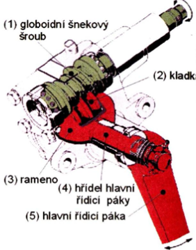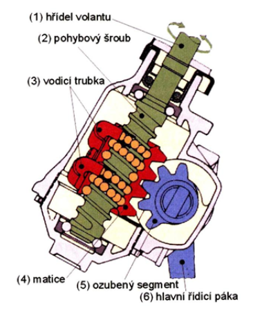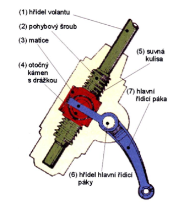 Při otáčení šroubu se matice pohybuje po závitu šroubu. Pohyb matice se přes kulisu převádí na hlavní páku řízení