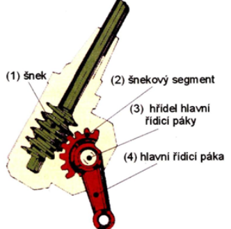 Pohybem volantu se natáčí šnek a tím i šnekový segment spojený s hřídelem hlavní řídící páky. Používá se u nákladních automobilů.