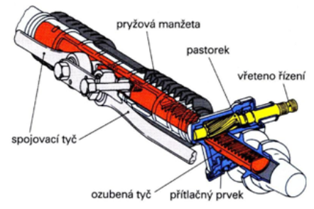 Pastorek, který je uložen ve skříní řízení a je umístěn na vřetenu, zabírá šikmým ozubením do ozubené tyče. Ozubená tyč je vedena v pouzdrech a stále je přitlačována k pastorku pružinou (talířovou). Tím dojde k vymezení vůle v ozubení.