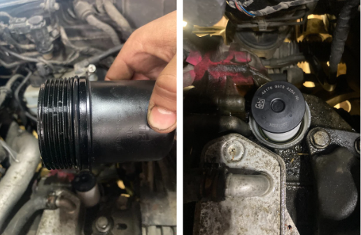 - Namontujeme speciální adaptér pro plnění převodovek (viz foto), na které nasadíme hadičku a pomocí čerpadla naplníme převodovku novým olejem.
